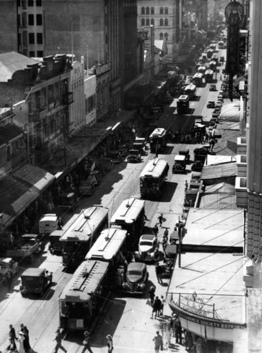| Keywords: StateLibQld 1 42671 Queen Street, Brisbane, ca. 1935.jpg en Queen Street Brisbane ca 1935 Elevated view of Queen Street Trams cars and pedestrians are passing up and down The Australian Temperance and General Mutual Life Assurance Society Ltd can be seen in the bottom right corner A sign for the Regent Building is prominent further along on the right hand side of the street Across the road stand buildings such as the Brisbane Arcade Coles and Co Ltd Oakden Chambers Woolworths Ltd and the National Bank Chambers circa 1935 handle 10462/deriv/143587 Item is held by John Oxley Library State Library of Queensland Contributor s C E McCarthy Studio PD-Australia StateLibQld-License Trams in Brisbane Automobiles of Australia Queen Street Brisbane 1935 in Queensland Black and white photographs Tram transport in the 1930s Black and white photographs of trams Trams from above |