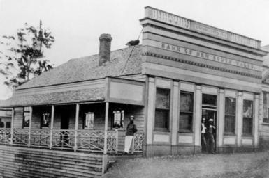 | Keywords: StateLibQld 1 46728 Bank of New South Wales, Gympie, ca. 1872.jpg en Bank of New South Wales Gympie ca 1872 The bank is a wooden building with brick facade The side aspect of the bank has a verandah with decorative railings On either side of the street entrance the bank's sash windows are covered with wooden blinds Gympie is a city in south-eastern Queensland situated on the Mary River about 162 kilometres north of Brisbane Gympie is the centre of an important dairying and agricultural district In the early days timber was a significant industry circa 1872 handle 10462/deriv/55594 Item is held by John Oxley Library State Library of Queensland PD-Australia StateLibQld-License Facades in Australia Shingle roofs Verandas on Queensland bank buildings Black and white photographs Bank of New South Wales Gympie Images from the State Library of Queensland |