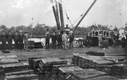 | Keywords: StateLibQld 1 49320 First shipment of Mt. Morgan blister copper from Rockhampton.jpg en First shipment of Mt Morgan blister copper from Rockhampton Men are posing on the docks while copper is being unloaded 1906-06-19 handle 10462/deriv/57431 Copied and digitised from an image appearing in The Capricornian Christmas issue 12 December 1908 Farmer; Contributor s Capricornian Rockhampton Qld PD-Australia StateLibQld-License 1906 in Queensland Black and white photographs of ships Cargo ships of Australia Copper ingots Groups of people in Australia Men's clothing of Australia Unidentified ships Wharves and quays in Australia Winches |