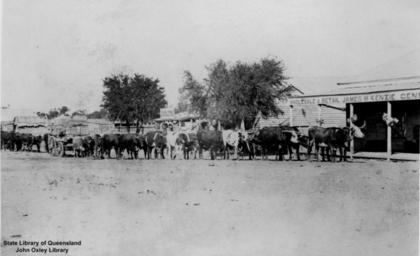 | Keywords: StateLibQld 1 54416 Bullock team outside James McKenzie's General Store at Blackall, Queensland, ca.1885.jpg en Bullock team outside James McKenzie's General Store at Blackall Queensland ca 1885 Loaded wagons and bullock teams waiting outside the James McKenzie General Store The store is a timber framed weatherboard building with a corrugated iron roof in a bungalow style and a verandah The sign on the store front reads 'Wholesale Retail James McKenzie General Store' 1885 handle 10462/deriv/60543 Item is held by John Oxley Library State Library of Queensland PD-Australia StateLibQld-License Bullock teams in Queensland General stores in Queensland Blackall Queensland 1885 in Queensland Black and white photographs |