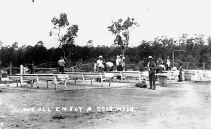 | Keywords: StateLibQld 1 54672 Enjoying a good wash at Enoggera Army Camp, ca. 1916.jpg en Enjoying a good wash at Enoggera Army Camp ca 1916 circa 1916 handle 10462/deriv/60390 Item is held by John Oxley Library State Library of Queensland PD-Australia StateLibQld-License Military buildings in Australia World War I home front in Brisbane Enoggera Queensland 1916 in Australia Black and white photographs | ||||