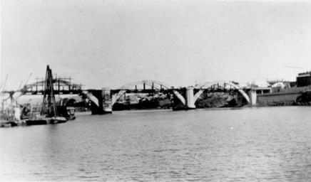 | Keywords: StateLibQld 1 69527 Construction of the William Jolly Bridge, Brisbane, 1931.jpg en Construction of the William Jolly Bridge Brisbane 1931 Construction of the William Jolly Bridge which linked North Quay on the north bank of the Brisbane River to Grey Street on the south bank The bridge opened to traffic on 30 March 1932 known then as the Grey Street Bridge 'Amongst the interesting features of the Bridge the length of which is 1634 feet are the three main arches over the river of 238 ft centres each rib consisting of structural steel fabricated under a sub-contract let by Messrs M R Hornibrook Ltd to Messrs Evans Deakin and Co Brisbane This steelwork was designed to support the concrete during construction without falsework ' Information taken from Souvenir official opening of Grey Street Bridge 1932 1931 handle 10462/deriv/84774 Item is held by John Oxley Library State Library of Queensland PD-Australia StateLibQld-License William Jolly Bridge construction Brisbane River 1931 in Brisbane Black and white photographs of bridges Black and white photographs of Brisbane |