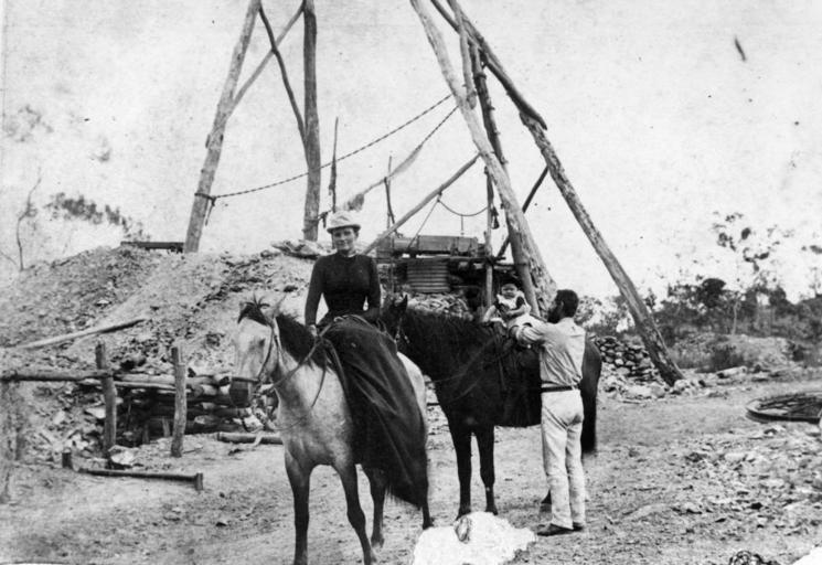 Keywords: StateLibQld 1 83955 Mining family outside their mine, Croydon, ca. 1890.jpg en Mining family outside their mine Croydon ca 1890 Croydon is located in the heart of the Gulf Savannah in north west Queensland When first settled in the 1880s Croydon was a large pastoral holding until gold was discovered in 1885 By 1887 the town's population had reached around 7 000 and during its heyday Croydon was the fourth largest town in the colony of Queensland A woman is on horseback and a man is placing a small child on a horse The mine can be seen in the background circa 1890 handle 10462/deriv/146032 Item is held by John Oxley Library State Library of Queensland PD-Australia StateLibQld-License Mines in Queensland Miners from Australia Horses of Queensland Families of Australia Croydon Queensland Black and white photographs |
