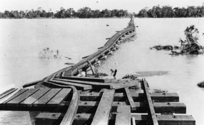 | Keywords: StateLibQld 1 90204 Flood damaged railway bridge over the Burdekin River, 1917.jpg en Flood damaged railway bridge over the Burdekin River 1917 Damaged railway bridge over the flooded Burdekin River with flood debris lodged arround the twisted steel railway tracks The force of the rising flood waters has moved the wooden bridge pylons in a small secton of the bridge The river bank on the far side is lined with mature trees 1917 handle 10462/deriv/65874 Item is held by John Oxley Library State Library of Queensland PD-Australia StateLibQld-License Floods in Queensland Railway bridges in Queensland Railway lines in Queensland 1917 in Queensland Black and white photographs of Queensland Damaged railway bridges |