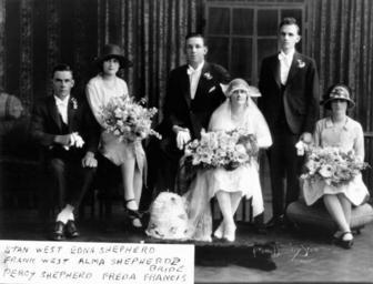 | Keywords: StateLibQld 1 95512 Wedding of Alma Shepherd and Frank West.jpg en Wedding of Alma Shepherd and Frank West Wedding party from left to right Stan West; Edna Shepherd; Frank West; Alma Shepherd; Percy Shepherd and Freda Francis The bridesmaids and bride are carrying large bouquets including lilies and daisies and daffodils Probably a spring wedding in Brisbane circa 1920 handle 10462/deriv/73652 Item is held by John Oxley Library State Library of Queensland Contributor s Trissie Deazeley Studio PD-Australia StateLibQld-License Portraits of Queensland Veils in Australia Wedding dresses in Australia Lounge suits in Australia Shoes of Australia Flower bouquets in Australia Brides of Australia Weddings in Brisbane Black and white photographs 1920 weddings |