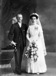 | Keywords: StateLibQld 1 96172 Frank Peters and his bride Ellen Eliza Shepherd, pictured on their wedding day, ca. 1905.jpg supplied with photograph circa 1905 handle 10462/deriv/74383 Item is held by John Oxley Library State Library of Queensland PD-Australia StateLibQld-License Portraits of Queensland Brides of Australia Grooms of Australia Wedding dresses in Australia Flower bouquets in Australia Black and white photographs | ||||