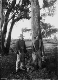 | Keywords: StateLibQld 2 101864 Swagmen standing under trees, outback Queensland, ca. 1905.jpg en Swagmen standing under trees outback Queensland ca 1905 Two men smoking pipes wearing hats and carrying bed rolls and billycans which are used for boiling water to make tea circa 1905 handle 10462/deriv/69060 Item is held by John Oxley Library State Library of Queensland PD-Australia StateLibQld-License Black and white photographs Clothing of Australia | ||||