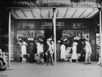 | Keywords: StateLibQld 2 107336 Shop front of Carnegie Brothers showroom in Queen Street, Brisbane, 1935.jpg en Shop front of Carnegie Brothers showroom in Queen Street Brisbane 1935 Window display of Carnegie Brothers showroom at 210 Queen Street Brisbane 1935 Pedestrians appear in the foreground Carnegie Brothers were music and musical instrument dealers Information taken from Queensland Post Office Directory 1930-31 1935 handle 10462/deriv/91842 Item is held by John Oxley Library State Library of Queensland PD-Australia StateLibQld-License Black and white photographs Queen Street Brisbane 1935 in Queensland Music stores |