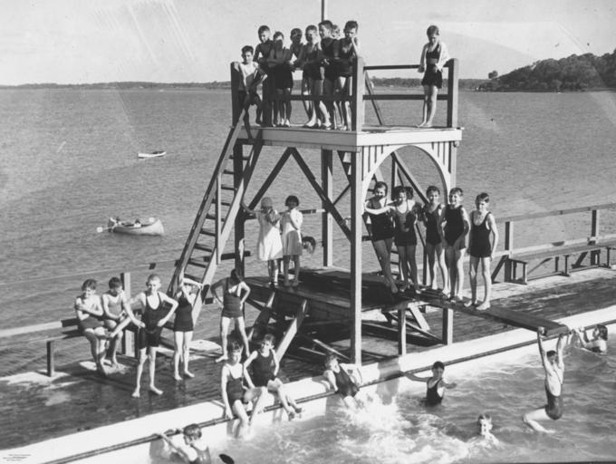| Keywords: StateLibQld 2 112504 Manly Swimming Pool, Brisbane, 1936.jpg en Manly Swimming Pool Brisbane 1936 This image depicts a swimming class for local school children They are gathered on the diving tower and diving board The water of the bay at Manly can be seen in the background 1936 handle 10462/deriv/133783 Item is held by John Oxley Library State Library of Queensland PD-Australia StateLibQld-License Groups of people in Australia Outdoor swimming pools in Australia Black and white photographs People in swimming pools Children of Queensland Swimwear of Australia Manly Queensland 1936 in Brisbane Springboards 1930s swimwear |