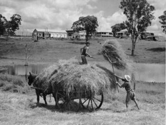 | Keywords: StateLibQld 2 115556 Loading hay at St Lucia, Brisbane, Queensland, 1936.jpg en Loading hay at St Lucia Brisbane Queensland 1936 Loading hay onto a horsedrawn wagon at the Farm School St Lucia The houses in the background were situated approximately 30 yards to the right of the Foundation Stone near the Administration Block at the University of Queensland 1936 handle 10462/deriv/135394 Item is held by John Oxley Library State Library of Queensland PD-Australia StateLibQld-License Horse-drawn carts in Queensland Black and white photographs St Lucia Queensland 1036 in Brisbane Hay wagons Horses of Brisbane |