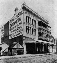 | Keywords: StateLibQld 2 15630 People's Cash Store at Fiveways, Wooloongabba, 1900.jpg en People's Cash Store at Fiveways Wooloongabba 1900 <br /> People's Cash Store on Stanley Street Woolloongabba consists of three storeys and has a large advertising sign on the side of the store 1900-12-01 handle 10462/deriv/456 the Queenslander 08 December 1900 p 1171 Contributor s Queenslander Brisbane Qld 1866-1939 PD-Australia StateLibQld-License Black and white photographs Architecture of Australia Shops in Brisbane 1900 in Brisbane Images from The Queenslander Woolloongabba Fiveways Advertisements on bricks |