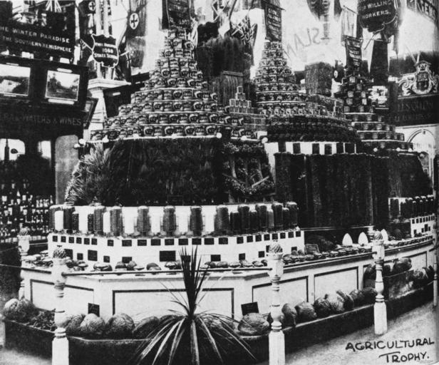 | Keywords: StateLibQld 2 194763 Queensland agricultural trophy, Franco-British Exhibition, London, 1908.jpg en Queensland agricultural trophy Franco-British Exhibition London 1908 Queensland agricultural display in the Australia Pavilion at the Franco-British Exhibition Shepherd's Bush London in 1908 On display are specimens of fruit grain and tinned pineapples The Queenslander newspaper cites comments about the Queensland court from the then Queensland Premier William Kidston 'It has one admirable feature which is worthy of special attention We have not spent money in the employment of London decorators but have shown our exhibits here just as we would have shown them in Brisbane The result is a much more genuine demonstration of what Queensland and Queensland's men can do in that way than the costly ornamental and more or less artistic trophies and things of that sort which have been put up in some of the other courts I am very pleased indeed with the work our own men have done in making use of the materials supplied to them Briefly we have made a very attractive show ' Information taken from The Queenslander 1 August 1908 p 32 1908 handle 10462/deriv/115684 The Queenslander 1 August 1908 p 24 Mobsby H W ; Contributor s Queenslander PD-Australia StateLibQld-License Agricultural exhibitions in Australia Black and white photographs 1908 in Australia Images from The Queenslander William Kidston |
