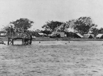 | Keywords: StateLibQld 2 198743 Camping at Maroochydore, Queensland, 1932.jpg en Camping at Maroochydore Queensland 1932 Campers in tents at Cottontree camping ground Maroochydore Swimmers are in the water and diving off a man made diving platform 1932 handle 10462/deriv/94810 Item is held by John Oxley Library State Library of Queensland PD-Australia StateLibQld-License Black and white photographs Maroochydore Queensland Swimmers from Australia Campsites in Queensland Swimwear of Australia 1932 in Queensland 1930s swimwear |