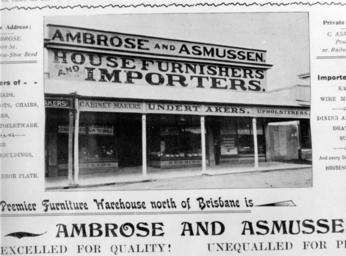 | Keywords: StateLibQld 2 202247 Ambrose and Asmussen, Furniture showroom in Gympie in 1903.jpg en Ambrose and Asmussen Furniture showroom in Gympie in 1903 Local furniture warehouse and undertakers in Gympie Gympie is a city in south-eastern Queensland situated on the Mary River about 162 kilometres north of Brisbane Gympie is the centre of an important dairying and agricultural district In the early days timber was a significant industry 1903 handle 10462/deriv/98452 Item is held by John Oxley Library State Library of Queensland PD-Australia StateLibQld-License Furniture shops in Australia Advertisements in Australia Black and white photographs Verandas on Queensland shops Signs in Queensland Buildings in Gympie 1903 in Australia Graphics 1903 advertisements Shop advertising Images from the State Library of Queensland |
