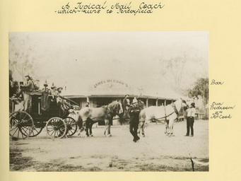 | Keywords: StateLibQld 2 236895 Mail coach at Wallangarra enroute to Tenterfield at the Royal Hotel.jpg en Mail coach at Wallangarra enroute to Tenterfield at the Royal Hotel James McCook was the licensee of the Royal Hotel at Wallangarra Wallangarra is 232 miles Sout west from Brisbane by rail It was a coaching stop for the mail coach at the border on the way to Tenterfield New South Wales Information taken from the Queensland Post Office Directory 1889 1887 handle 10462/deriv/37537 Item is held by John Oxley Library State Library of Queensland Dewhurst A PD-Australia StateLibQld-License Men's clothing of Australia Black and white photographs Stagecoaches in Queensland Surveyors from Australia Wallangarra Queensland Horses of Queensland 1887 in Australia Passengers |