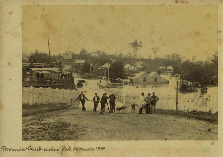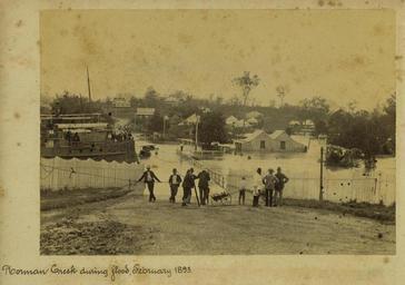 | Keywords: StateLibQld 2 243614 Norman Creek during flood, February 1893.jpg en Norman Creek during flood February 1893 1893 floods in Brisbane has inundated the land close to the river A rope has been strung across the road to assist pedestrians and small boats to cros the river 1893 handle 10462/deriv/118857 Item is held by John Oxley Library State Library of Queensland PD-Australia StateLibQld-License Black and white photographs Rivers of Queensland Boats in Australia 1893 in Queensland | ||||