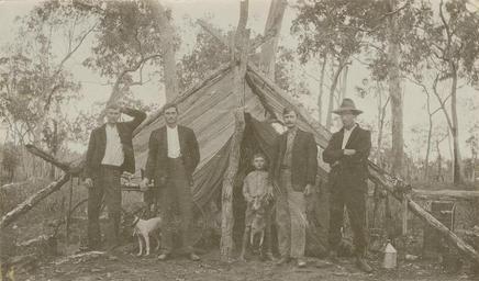 | Keywords: StateLibQld 2 253488 Hunting camp in North Queensland, ca. 1908.jpg en Hunting camp in North Queensland ca 1908 The tent is pitched over logs Four men two dogs and a young boy are posing outside the tent Two of the men have been named on the postcard They are Bob Stewart left and Jack Stewart right circa 1908 handle 10462/deriv/119881 Copied and digitised from a postcard PD-Australia StateLibQld-License Images of postcards from the State Library of Queensland Children's clothing of Australia Men's clothing of Australia Black and white photographs Tents in Australia Dogs of Australia Camping |