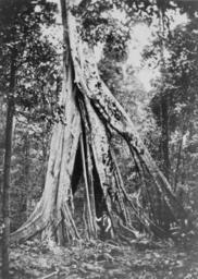 | Keywords: StateLibQld 2 394253 Strangler fig tree, Bunya Mountains, 1913.jpg en Strangler fig tree Bunya Mountains 1913 Strangler Fig is the common name for a number of tropical plant species These plants begin life as epiphytes when their seeds often bird-dispersed germinate in crevices atop other trees These seedlings grow their roots downward and envelop the host tree while also growing upward to reach into the sunlight zone above the canopy 1913 handle 10462/deriv/192691 Item is held by John Oxley Library State Library of Queensland PD-Australia StateLibQld-License Bunya Mountains National Park Black and white photographs Trees in Australia Unidentified Ficus 1913 in Queensland Rainforests Vines |