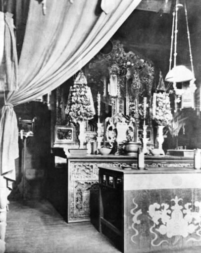 | Keywords: StateLibQld 2 54268 Altar in the Cairns Joss House, 1929.jpg en Altar in the Cairns Joss House 1929 Interior view of ceremonial candlesticks and offerings The altar is intricately carved wood 1929 handle 10462/deriv/60112 The Queenslander 12 December 1929 p 42 Contributor s Queenslander Brisbane Qld 1866-1939 PD-Australia StateLibQld-License Religious buildings in Australia Black and white photographs Altars in Queensland Flowers of Australia Buildings in Cairns Lighting in Australia z 1929 in Queensland Candlesticks Chinese temples Joss houses in Queensland |