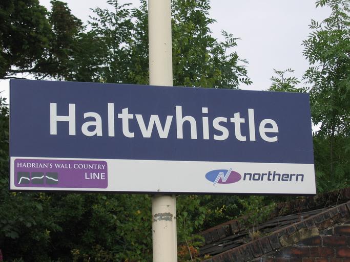 Keywords: Station Sign Haltwhistle.JPG en Station sign Haltwhistle Rly station own Reinhard Dietrich 2009-08 Haltwhistle railway station