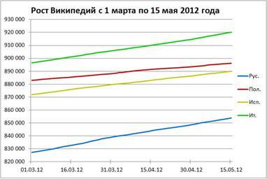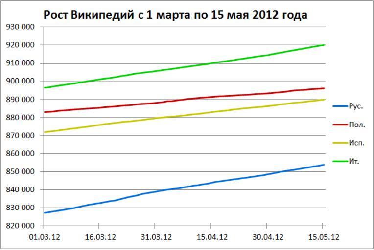 | Keywords: StatisticsWikipedias 1march2012 15may2012.png ru Г афики оста числа статей с 1 ма та по 15 мая 2012 года в усском польском испанском и итальянском азделах Г афики сглажены Сделано в Microsoft Excel 2010 en Graphics of growth of the number of articles from 1 March to May 15 2012 in Russian blue Polish red Spanish gold and Italian green sections The graphics are smooth Made by Microsoft Excel 2010 2012-05-15 own Brateevsky cc-zero Uploaded with UploadWizard Wikipedia statistics by language |
