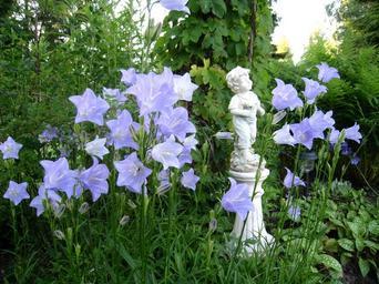 Keywords: statue boy flowers pidestal grass green summer tree garden blue bells