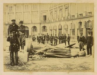 | Keywords: Statue of Napoleon I after the Fall of the Vendôme Column WDL1287.png Artwork ru Б аквейе Б уно 1823 1875 гг fr Braquehais Bruno 1823-1875 en Braquehais Bruno 1823-1875 zh 布鲁诺·布拉奇海 ,1823-1875 年 pt Braquehais Bruno 1823-1875 ar براكهيه برونو، 1823-1875 es Braquehais Bruno 1823-1875 ru Статуя аполеона I после сноса Вандомской колонны fr Statue de Napoléon Ier après la chute de la colonne Vendôme en Statue of Napoleon I after the Fall of the Vendôme Column zh 旺多姆 柱 下后拿破仑 世的雕像 pt Estátua de Napoleão I depois da derrubada da Coluna de Vendôme ar تمثال نابليون الأول بعد سقوط عمود فندوم ru П ичиной ф анко-п усской войны стал ост нап яженности в отношениях между Ф анцией и П уссией в 1860-х гг Ф анция п и импе ато е аполеоне III была полна ешимости п ове ить астущую силу П уссии и отомстить за то что она ассмат ивала как яд дипломатических унижений П уссия п и канцле е Отто фон Бисма ке считала что война ге манских госуда ств п отив Ф анции под уководством П уссии станет ешающим шагом к созданию единой Ге манской импе ии Конфликт начался 19 июля 1870 г когда Ф анция объявила войну Ф анцузская а мия оказалась ужасно неподготовленной и поте пела сок ушительное по ажение в битве п и Седане отк ыв до огу на Па иж К 19 сентяб я немцкие войска полностью ок ужили го од и начали осаду кото ая п одлилась более четы ех месяцев От езанные от поставок п одовольствия из сельской местности па ижане пытались выжить питаясь собаками кошками и даже животными из па ижского зоопа ка Де евья на Елисейских полях и в па ках были вы ублены и использованы в качестве топлива 5 янва я немецкие войска начали бомба ди овку го ода кото ая п одолжалась по несколько часов каждую ночь в течение 23 суток а ок естности Па ижа было сб ошено около 12 000 сна ядов кото ые убили около 400 человек Па иж сдался 28 янва я в сущности положив конец войне За по ажением ф анцузов последовало на одное восстание и установление в а те 1871г Па ижской коммуны еволюционного п авительства сфо ми ованного в соответствии с ана хистскими и социалистическими п инципами Коммуна была жестоко подавлена в мае 1871 г ф анцузскими войсками п авительства Адольфа Тье а Во в емя неп одолжительного конт оля над Па ижем коммуна ы аз ушали импе ато скую колонну на Вандомской площади Подавление коммуны п ивело к дальнейшим значительным аз ушениям в го оде когда коммуна ы подожгли дво ец Тюиль и Лув и д угие здания К оме того многие здания пост адали или были аз ушены во в емя отчаянной пе ест елки между коммуна ами и конт еволюционными силами Siege de Paris 1870 1871 Осада Па ижа 1870 1871 гг п едставляет собой альбом из 110 фотог афий сделанных Огюстом Б уно Б аквейе 1823 1875 гг ф анцузским фотог афом и п ог ессивным фотожу налистом документи овавшим осаду и последствия бомба ди овок а также аз ушения п оизошедшие во в емя Па ижской коммуны <br>Вандомская колонна Па иж Ф анция ; Ф анко-п усская война 1870 1871 гг ; Г упповые по т еты; Память ми а; По т етные фотог афии; Солдаты; Статуи; Уще б нанесенный войной fr La guerre franco-allemande fut provoquée par l escalade des tensions entre la France et la Prusse dans les années 1860 La France sous l empereur Napoléon III était déterminée à contenir la croissance de la puissance prussienne et à venger ce qui était considéré comme une série d humiliations diplomatiques La Prusse sous le chancelier Otto von Bismarck considérait qu une guerre dirigée par la Prusse et menée par les États allemands contre la France serait un acte décisif menant à la création d un empire allemand unifié Le conflit débuta le 19 juillet 1870 jour où la France déclara la guerre L armée française s avéra terriblement mal préparée et subit une défaite désastreuse lors de la bataille de Sedan laissant la voie libre vers Paris Le 19 septembre les Allemands encerclèrent complètement la ville et commencèrent un siège qui allait durer plus de quatre mois Coupés du ravitaillement provenant de la campagne les Parisiens survécurent en man