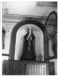 | Keywords: Statue of "Nuestra Senora" (Our Lady of Sorrow) at the Presidio Church at Mission San Carlos Borromeo, Monterey, ca.1906 (CHS-4151).jpg en <br> Statue of Nuestra Señora Our Lady of Sorrow at the Presidio Church at Mission San Carlos Borromeo Monterey ca 1906 Photograph of a statue of Nuestra Señora Our Lady of Sorrow at the Presidio Church at Mission San Carlos Borromeo Monterey ca 1906 The beseeching figure stands with hands clasped A crown of light rays eminates from her head The glass door to the alcove inset in the wall is open A small cross containing a relic sits at the feet of the statue at right A wooden cabinet is inset below the statue Two other figures stand at either side Ornamental painting is on the walls and ceiling Call number CHS-4151 Legacy record ID chs-m16652; USC-1-1-1-14075 Photographer James George Wharton Filename CHS-4151 Coverage date circa 1906 Part of collection California Historical Society Collection 1860-1960 Type images Geographic subject city or populated place Carmel Repository name USC Libraries Special Collections Accession number 4151 Microfiche number 1-126-17 Archival file chs_Volume96/CHS-4151 tiff Part of subcollection Title Insurance and Trust and C C Pierce Photography Collection 1860-1960 Repository address Doheny Memorial Library Los Angeles CA 90089-0189 Geographic subject country USA Format aacr2 3 photographs glass photonegative photoprints b w ; 22 x 17 cm Rights Digitally reproduced by the USC Digital Library; From the California Historical Society Collection at the University of Southern California Subject adlf religious facilities Project USC Repository email specol usc edu Identifying number plate no 64-G Contributing entity California Historical Society Date created circa 1906 Publisher of the digital version University of Southern California Libraries Format aat photographic prints; photographs Geographic subject state California Subject file heading Missions -- Mission Carmel San Carlos Borromeo de Carmelo ; Mission Carmel -- San Carlos Borromeo de Carmelo Format glass plate negatives Access conditions Send requests to address or e-mail given Phone 213 821-2366; fax 213 740-2343 Geographic subject county Monterey Subject lcsh Missions Spanish Subject Carmel Mission 1906 James George Wharton http //digitallibrary usc edu/cdm/ref/collection/p15799coll65/id/16586 PD-old-70-1923 Images from USC Digital Library uploaded by Fæ California Historical Society Collection 1860-1960 Glass plate negatives Photographs by George Wharton James Interior of Mission San Carlos Borromeo de Carmelo Statues of Virgin Mary in the United States |
