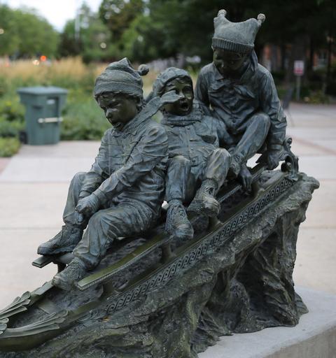 Keywords: statue outside children sled outdoors bronze sculpture iron art architecture city old history landmark outdoor town green historic tourism park monument structure