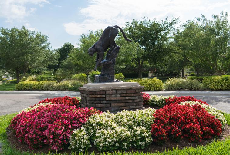 Keywords: statue panther garden flowers sculpture animal cat stone tropical sky sunny