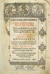 Keywords: Stavropoleos-evanghelie-1723-p01.png Gospel Book title page Printed in Bucharest in 1723 during the reign of Nicolae Mavrocordat in Romanian with Cyrillic characters <br> Transliteration from Cyrillic to modern Romanian alphabet SFÂNTA ȘI DUMNEZEIASCA EVANGHELIE   Cu voia prea luminatului È™i înăl È›atului Domn È™i oblăduitoriu atoată È›ara Rumânească Io   NICOLAE Alecsandru Voevod MAVROCORDATU   Cu blagosloveniea È™i cu toată chieltuiala pur tătoriului pravoslaviei prea SfinÈ›itul   Kir DANIIL   Mitropolitul atoată È›ara Rumâ nească È™i exarhu plaiurilor   Acum întracesta chip Tipărită È™i diorthosită în scaunul Domniei în BucureÈ™ti   La anul dela spăseniea lumii 1723 ---- De cucearnicul întru PreoÈ›i Popa Stoica Iacovici Translation HOLY AND GODLY GOSPELS   By the will of the enlightened and glorified Lord and shielder of the whole Wallachia We   NICHOLAS Alexander Voivode MAVROCORDATOS   Under the blessing and through the expense of our guider to Orthodoxy the hallowed   Kyrios DANIIL   Metropolitan of whole Wallachia and exarch of the lands   Now in this way printed and improved in the seat of the court in Bucharest   In the year of world's redemption 1723 ---- By the pious among priests Father Stoica Iacovici See also Page 2 of the book B-II-a-A-19464 http //www ortodoxmedia com/inregistrare/345/Sfanta-si-Dumnezeiasca-Evanghelie-1723 I user adriatikus have extracted the title page from the PDF released by Stavropoleos Monastery a digitization of the 1723 original found in their library Originally printed during the reign of Nicolae Mavrocordat under the authority of Daniel Metropolitan of Wallachia by priest Stoica Iacovici 1723 PD-old-100 Stavropoleos Church 1700 Romanian Cyrillic alphabet Gospel Books