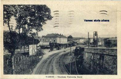 Keywords: La stazione delle Ferrovie Nord Milano (1885), tra gli alberi a sinistra si intravedono le ciminiere dello stabilimento dei Molini Marzoli Massari. varese