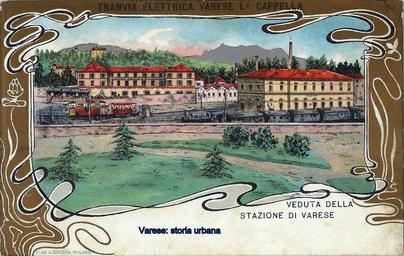 | Keywords: Versione colorata. La stazione delle Ferrovie Nord Milano (1885) e il capolinea della tranvia per la Prima Cappella (1895). Sul piazzale lo stabilimento del Calzaturificio di Varese e dietro la stazione le ciminiere dei Molini Marzoli Massari. tram varese |