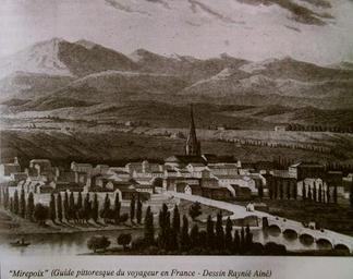 Keywords: StBarth490.jpg Mirepoix vue du château de Terride Au fond le massif de Tabe pic de Saint-Barthélemy du Soularac Mont Fourcat etc gravure du XIXe siècle 2007 Pierre Bénard Mirepoix Ariège Mountains of Ariège