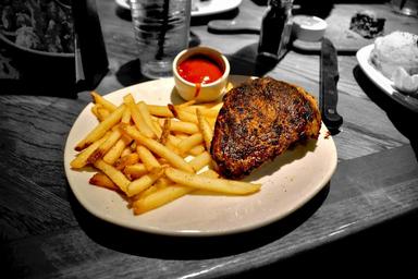 Keywords: steak chips meal food table cutlery kitchenware beef potato dinner meat cooking