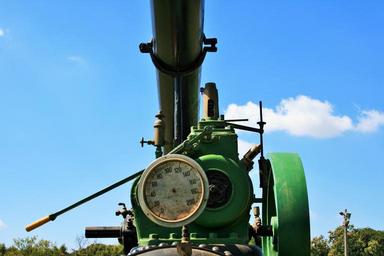 Keywords: steam engine black green smoke stack dials wheels power mobile agriculture museum