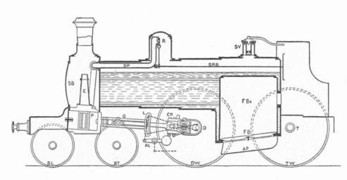 | Keywords: Steam locomotive, side section (Heat Engines, 1913).jpg Cross-section through a steam locomotive The locomotive is unidentified but is a typical 4-4-0 passenger locomotive of the late 19th century - FBx Fire box - FB Fire bars - AP Ash pan - SB Smoke box - SV Safety valve - R Steam regulator valve - SRB Steam regulator valve operating bar between the regulator handle in the cab and the valve in the dome - SP Steam pipe - E Exhaust pipe - P Steam ports - G Guides - L Stephenson link motion - RL Reversing lever - CR Connecting rod - C Cylinder - D Driving axle - T Trailing axle - DW Driving wheel - TW Trailing wheel - BL Bogie leading wheel - BT Bogie trailing wheel - CG Coupling rod Steam locomotive boilers Cross sections of steam engines Sectioned drawings of steam locomotives Sectioned drawings of steam boilers |