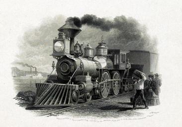 Keywords: steam train train transport paddle steamer passengers travelers people vintage art card poster print black white