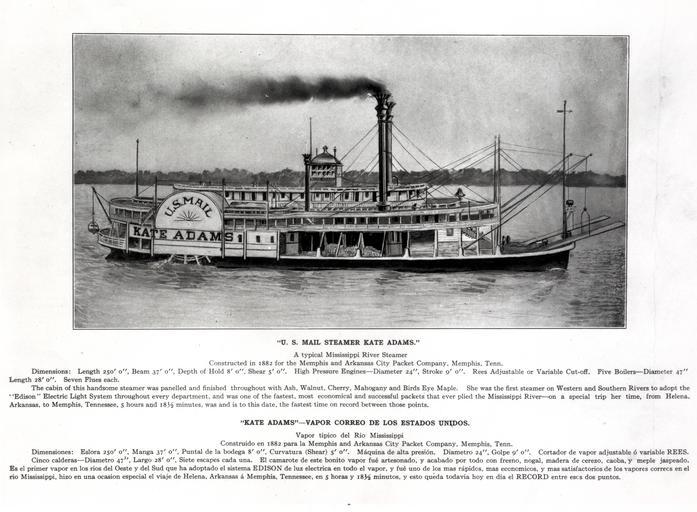 | Keywords: smithsonian institution smithsonianinstitution steamboat dampfschiff usps mail boat kate adams kateadams river boat riverboat rivierboot raderboot mail steam boat mailsteamboat mississippi river mississippiriver photograph mississippi river large steamboat largesteamboat mail ship mailship black and ehitr blackandehitr paddleboat steam riverboat paddlewheel wooden ship paddleboatsteamriverboatpaddlewheelwoodenship us mail usmail national postal museum nationalpostalmuseum mail across the commons mailacrossthecommons blackandwhite black and white Description: "Kate Adams," a U.S. Mail steamboat, moves on the Mississippi River. The "Kate Adams" was built in 1882. Creator/Photographer: Unidentified photographer Medium: Black and white photographic print Culture: American Geography: USA Date: 1882 Collection: U.S. Mail Packets and Boats Repository: National Postal Museum Accession number: A.2006-90 Persistent URL: arago.si.edu/index.asp?con=2&cmd=1&id=194342 View more collections from the Smithsonian Institution. Description: "Kate Adams," a U.S. Mail steamboat, moves on the Mississippi River. The "Kate Adams" was built in 1882. Creator/Photographer: Unidentified photographer Medium: Black and white photographic print Culture: American Geography: USA Date: 1882 Collection: U.S. Mail Packets and Boats Repository: National Postal Museum Accession number: A.2006-90 Persistent URL: arago.si.edu/index.asp?con=2&cmd=1&id=194342 View more collections from the Smithsonian Institution. |