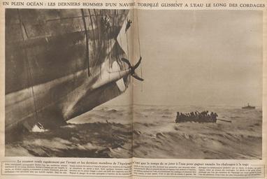 | Keywords: Steamer coulant dans l'Atlantique en 1917.jpg fr Navire anglais torpillé par un sous-marin allemand lors de la bataille de l'Atlantique en 1917 Photographie publiée par l'hebdomadaire français Le Miroir le 20 mai 1917 en English ship sinks after being torpedoed by a German submarine during the Battle of the Atlantic in 1917 approximate translation Above; In the middle of the ocean the last men of a torpedoed ship water slide along the strings Below This photograph shows one of the many tragedies of our time Hit by a torpedo on the bow the English steamer runs slowly then faster and faster The boats have been put in the water and most of the crew was rescued Only a few men in danger of being swallowed up had to escape by throwing himself back into the sea or using rope ladders To the right a small steamer comes to the rescue of shipwrecked The photograph is from a boat carried by one of the crew members who evacuated the ship Photograph published by the French weekly Le Miroir May 20 1917 1917-05-20 http //gallica bnf fr/ark /12148/cb40360453x/date1917 Gallica fr author anonymous-EU PD-US-1923 Uploaded with UploadWizard Naval warfare of World War I Atlantic theatre of World War I Le Miroir |