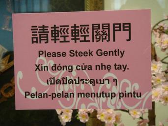 | Keywords: Steek.JPG Image taken by author of a sign on a door This is an example of Chinglish This door is located in the city of Taipei Taiwan the foreign immigrants recreational hall administered by the Taipei government The word Steek is a legitimate English word except it fell from common use hundreds of years ago From bottom to top the languages are Chinese English Vietnamese Thai and Bahasa Indonesia en wikipedia Sfan00_IMG CommonsHelper 2006-11-28 LoopTel wikipedia en LoopTel en Original upload log page en wikipedia Steek JPG 2006-11-28 05 50 LoopTel 2 048 × 1 536 1359352 bytes <nowiki>Image taken by author of a sign on a door This is an example of Chinglish This door is located in the city of Taipei Taiwan the foreign immigrants recreational hall administered by the Taipei government The word Steek is a legitimate English word </nowiki> English language Chinese languages Thai language Vietnamese language Indonesian language Multilingual signs Multilingual media Chinglish ImageNote 1 212 269 1661 1019 2048 1536 2 Please steek close gently Pelan-pelan menutup pintu ๠ปิดปิดประตู๠บา ๆ Xin đóng cá»a nhẹ tay è¯·è¼•è¼•é— é– è¯·è½»è½»å…³é—¨ ImageNoteEnd 1 |