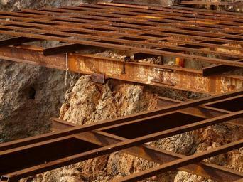 Keywords: steel beams old rusty steel mesh grid metal platform