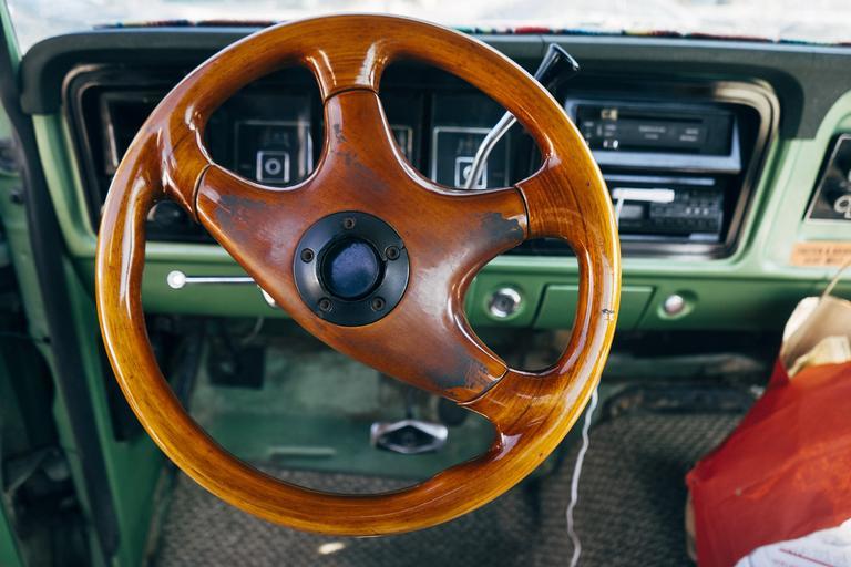 Keywords: steering wheel car interior steering drive driving driver vehicle dashboard auto transport transportation automobile speedometer odometer journey automotive wood grain vintage green dash shifter