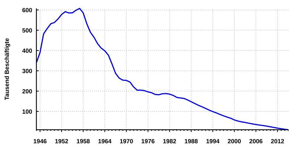 | Keywords: Steinkohle arbeiter.svg de Arbeiter im Steinkohleabbau in Deutschland 2016-02-01 own StefanPohl other versions v reset set term svg size 800 400 fname 'Arial bold' fsize 16 lw 2 set grid lc rgb ' AAAAAA' lt 2 dt ' ' lw 75 set border 3 set tics nomirror scale 5 set xtics out set autoscale fix set style line 1 lc rgb 'blue' lw 1 5 unset key basename 'steinkohle_' outext ' svg' inext ' txt' set timefmt ' Y' set xdata time set format x ' Y' current basename 'arbeiter' set ylabel 'Tausend Beschäftigte' set output current outext plot current inext u 1 2/1e3 w l ls 1 unset output current basename 'foerderung' set ylabel 'Millionen Tonnen' set output current outext plot current inext u 1 2/1e6 w l ls 1 unset output current basename 'bergwerke' set ylabel 'Bergwerke' set output current outext plot current inext u 1 2 w l ls 1 unset output cc-zero Coal mining in Germany |