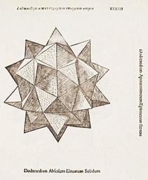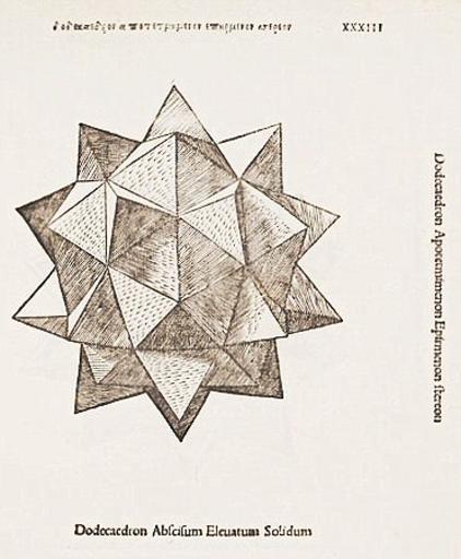 | Keywords: Stellated Dodecahedron Luca Pacioli and Leonardo da Vinci 1509.jpg en Stellated Dodecahedron from De divina proportione by Luca Pacioli woodcut by Leonardo da Vinci Venice 1509 1509 http //www maa org/publications/periodicals/convergence/mathematical-treasures-de-divina-proportione-by-luca-pacioli Luca Pacioli Leonardo da Vinci other versions Custom license marker 2015 06 07 PD-old-100 Uploaded with UploadWizard Woodcuts Luca Pacioli Geometric studies by Leonardo da Vinci Polyhedral stellations De divina proportione |