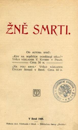 Keywords: Stempl mzk Necas 00 uvodni stranka.jpg Fotografie z knihy Žně smrti s razítkem Moravské zemské knihovny v Brně A photo from the book Žně smrti with the former stamp of the Moravian Library in Brno Own 2004-10-23 Nostrifikator PD-old 1905 Moravian Library Library rubber stamps Seals with Czech language inscriptions Location not applicable |