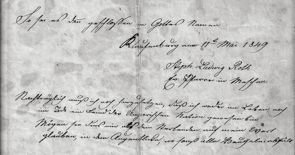 | Keywords: Stephan Ludwig Roth Abschiedsbrief Ausschnitt z.jpg Transkription So sei es denn geschlossen in Gottes Namen Klausenburg am 11 Mai 1849<br/>Stephan Ludwig Roth <br/>Ev Pfarrer in Meschen Nachträglich muß ich noch dazusetzen daß ich weder im Leben noch im Tode ein Feind der ungarischen Nation gewesen bin Mögen sie dies mir als dem Sterbenden auf mein Wort glauben in dem Augenblick wo sonst alle Heuchelei abfällt Ausschnitt aus einer alten Abschrift von Stepahn Ludwig Roths Abschiedsbrief an seine Kinder Alte Abschrift de wikipedia by DietG Transfered by Hkoala Text Stephan Ludwig Roth; Abschrift unbekannt 1849 PD-old-100 Original upload log Upload date User Bytes Dimensions Comment 2010-04-29 21 56 30 de User DietG DietG 988986 1280×672 <small><nowiki> Information Ausschnitt aus eine alten Abschrift von Stepahn Ludwig Roths Abschiedsbrief an seine Kinder Alte Abschrift unbekannt Andere Versionen Klausenburg am 11 Ma</nowiki></small> Manuscript letters written messages Stephan Ludwig Roth |