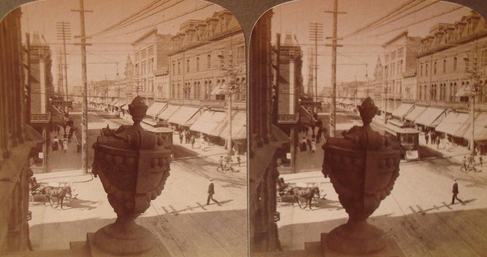 | Keywords: "9881-Government Street, looking north. Victoria, B. C. Copyright 1907 by Underwood & Underwood. U-105430" Underwood & Underwood, Publishers. New York, London, Toronto Canada, Ottawa-Kansas. Works & Studios — Arlington, N.Y. Westwood, N.Y. Sun Sculpture Trade Mark. View looking north up Government Street from the intersection at Fort Street into the 1100-block in Victoria, BC on Vancouver Island. The block of buildings on the east side (right) of the street, including the Five Sisters Block (far right) was destroyed by the fire of October 1910. Photo taken from the Bank of British Columbia Building (built 1886; extant). "9881-Government Street, looking north. Victoria, B. C. Copyright 1907 by Underwood & Underwood. U-105430" Underwood & Underwood, Publishers. New York, London, Toronto Canada, Ottawa-Kansas. Works & Studios — Arlington, N.Y. Westwood, N.Y. Sun Sculpture Trade Mark. View looking north up Government Street from the intersection at Fort Street into the 1100-block in Victoria, BC on Vancouver Island. The block of buildings on the east side (right) of the street, including the Five Sisters Block (far right) was destroyed by the fire of October 1910. Photo taken from the Bank of British Columbia Building (built 1886; extant). |