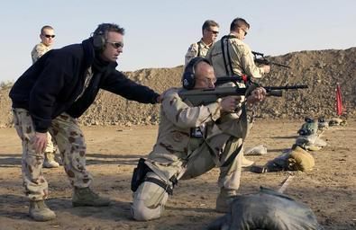 | Keywords: Steyr AUG DF-SD-06-01775.jpg Range officer Corporal CPL Greg Maxted left Australian Air Traffic Control ATC Detachment DET Task Unit 633 4 2 teaches Special Agent Peter Davis 447th Office of Special Investigations OSI how to fire a F88 5 56 mm Weapon System at the Baghdad International Airport firing range Baghdad Iraq during Iraq War Operation IRAQI FREEDOM http //www dodmedia osd mil/Assets/2006/Air_Force/DF-SD-06-01775 JPEG 2003-12-04 SSGT STACY L PEARSALL USAF PD-USGov Kneeling men Males with assault rifles Baghdad in the Iraq War Shooting Steyr AUG Shooting ranges Iraq Air Force Office of Special Investigations Military history of Australia during the Iraq War |