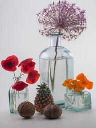 Keywords: still life bottles flowers poppies glass pineapple